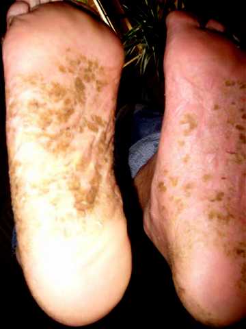 Am 18.08.2011 Moin Dieter, sowie versprochen kommen hier ein paar Bilder von Dirks Füße. 4 Tage nach Beginn der Behandlung spürte Dirk keine Schmerzen mehr, er konnte Nachts wieder schlafen, noch ein paar Tage später fing die alte Haut an sich abzulösen. Neue bildete sich. Nochmal danke für das fantastische Wasser! Du weißt, hier steht immer Kaffee für dich. Schöne Grüße, Dirk und Marion Penders |